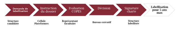 La procédure de labellisation se décline en deux parcours distincts (première demande ou renouvellement) à l’issue desquels le label est attribué pour une durée de 5 ans maximum. Il est à noter que la durée du label attribué par le Comité Plateformes ne saurait aller au-delà de la labellisation de l’unité à de rattachement, par l’université.